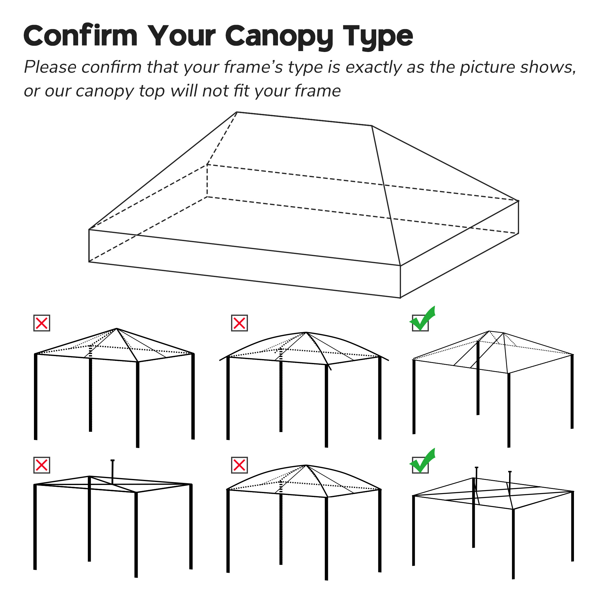- Measurement Tips - Helps you determine whether the tent frame fits our canopy top: 1st, measure the length and width of your tent frame; 2nd, measure the central pole of the frame; Please make sure any of your measurements should not exceed the compatible frame size range, otherwise it will not fit your frame